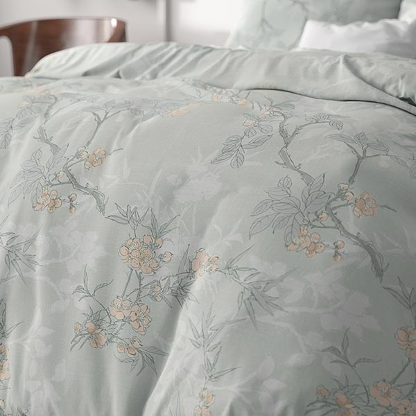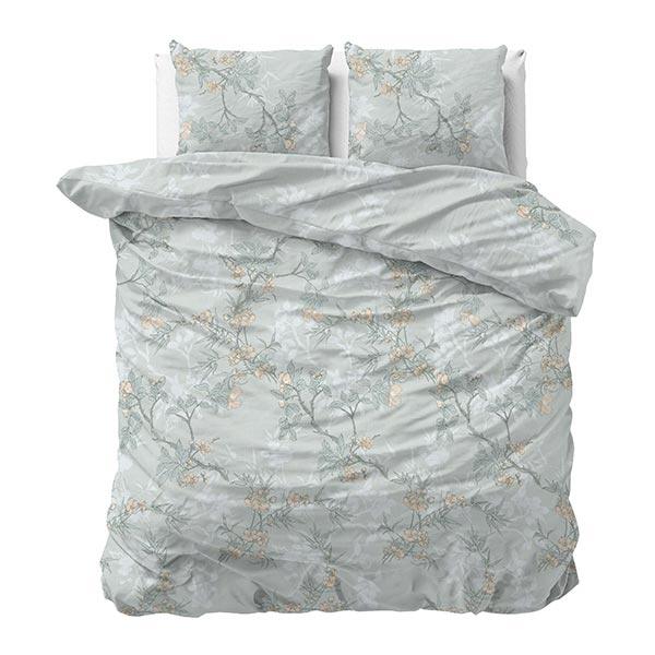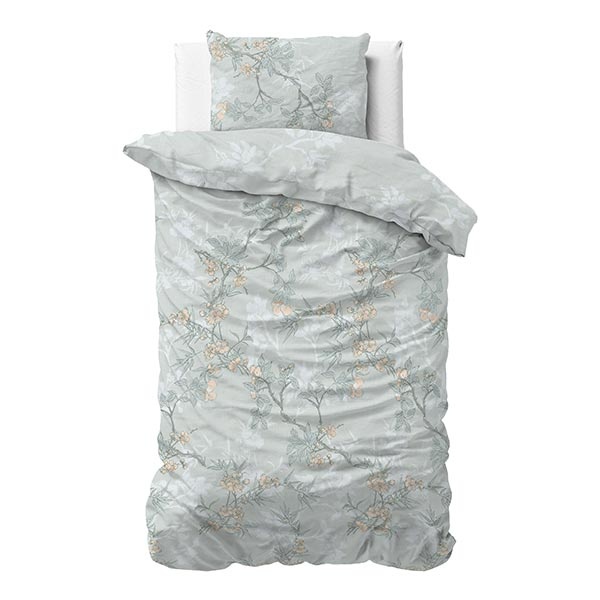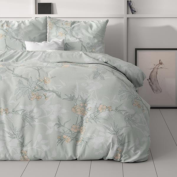 Dit Blossom dekbedovertrek combineert een luchtig blauwgroen met subtiele bloesemtakken en zachte bloemaccenten, wat zorgt voor een frisse en rustige sfeer in je slaapkamer.