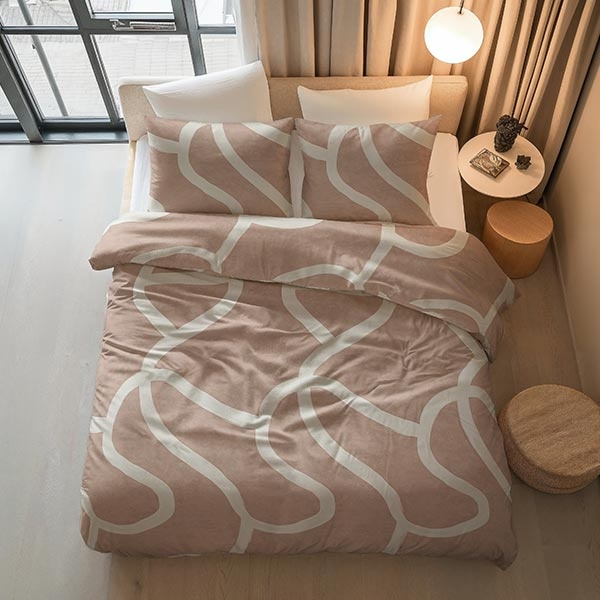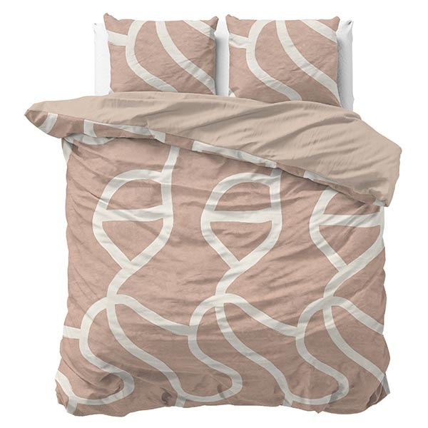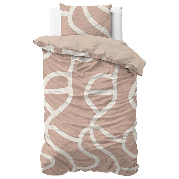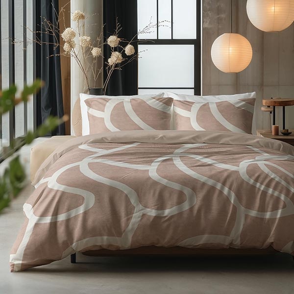 Zacht, modern en speels tegelijk. Het Clay Contours dekbedovertrek laat golvende lijnen sierlijk over een perzikbruine achtergrond stromen. Het dessin brengt een gevoel van rust en beweging in één.