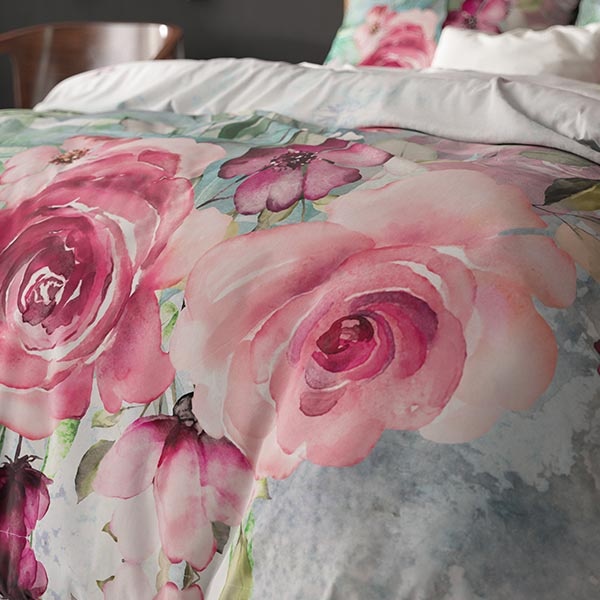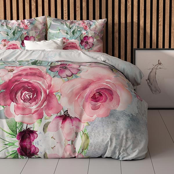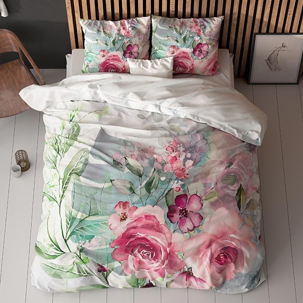 Dit Desire dekbedovertrek is een explosie van kleur en romantiek. Met prachtige rozen, frisgroene bladeren en een vleugje aquarelstijl haal je een fraai schilderij in huis. De haarscherpe print laat elk bloemblaadje tot leven komen, alsof je onder een bloemenzee wegdroomt.