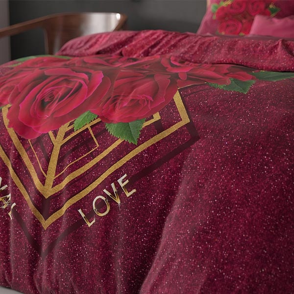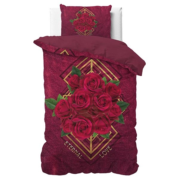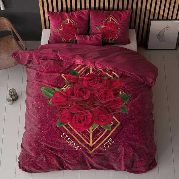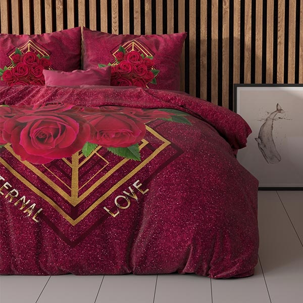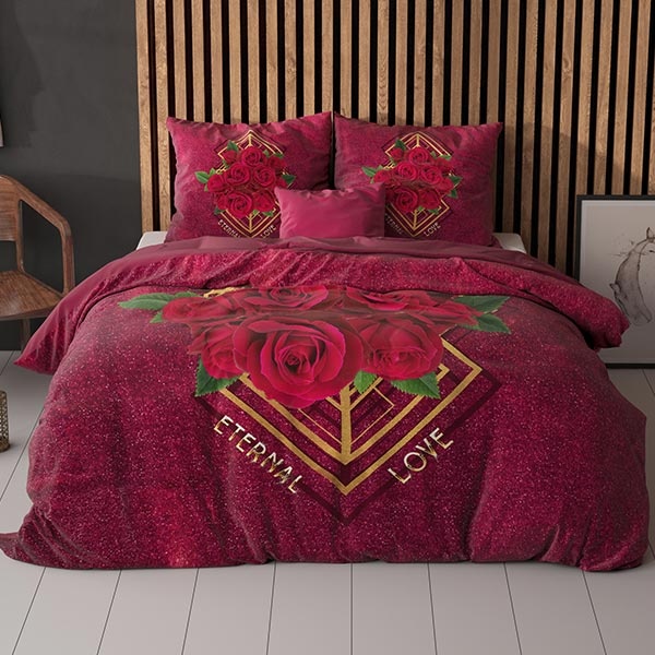 Dit Eternal Love dekbedovertrek straalt liefde en elegantie uit met zijn diepe rode tint, prachtige rozen en stijlvolle gouden accenten. Een echte eyecatcher in de slaapkamer.