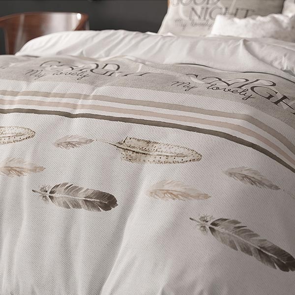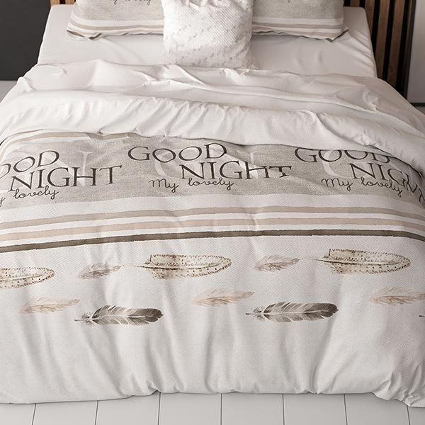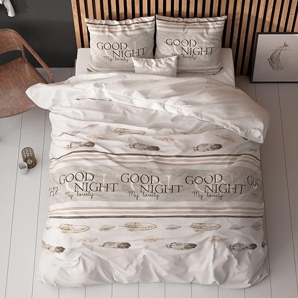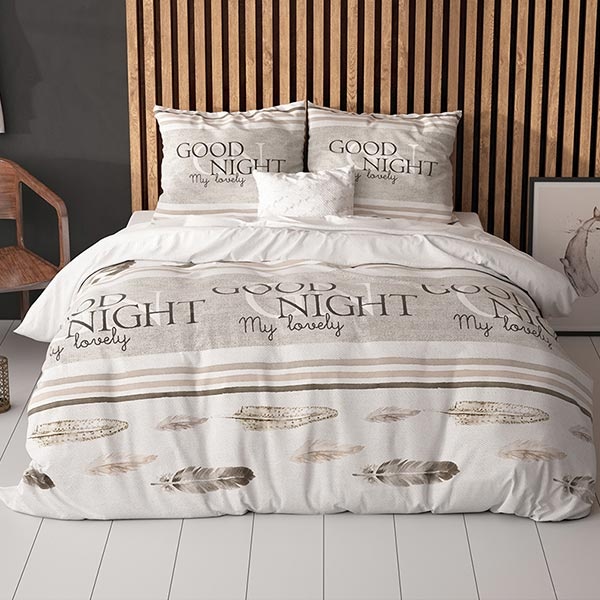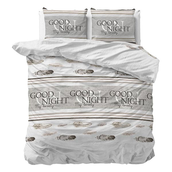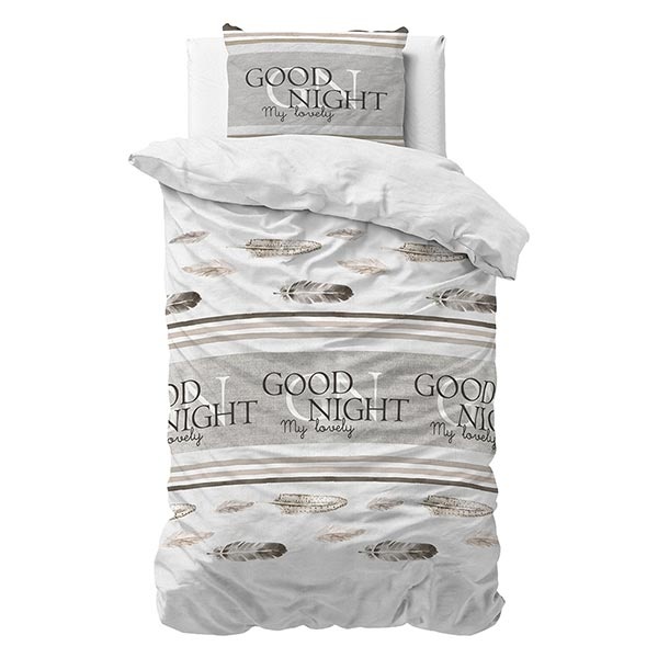 Ontspan en geniet van een goede nachtrust onder dit prachtige Good Night dekbedovertrek van Sleeptime! Het sfeervolle dessin van mooie veren in natuurlijke grijsbruine tinten op een witte ondergrond zorgt voor een harmonieuze en rustgevende sfeer in je slaapkamer. Met de romantische tekst 'Goodnight my lovely' is dit dekbedovertrek perfect om de dag in stijl af te sluiten en je klaar te maken voor een diepe en verkwikkende slaap. Laat de natuurlijke schoonheid je omhullen en word elke ochtend uitgerust wakker onder dit prachtige dekbedovertrek!