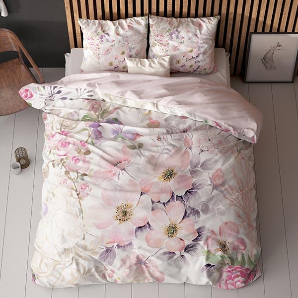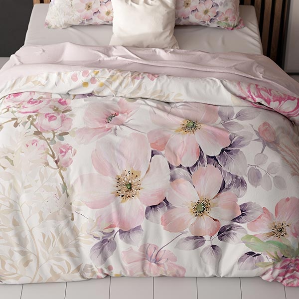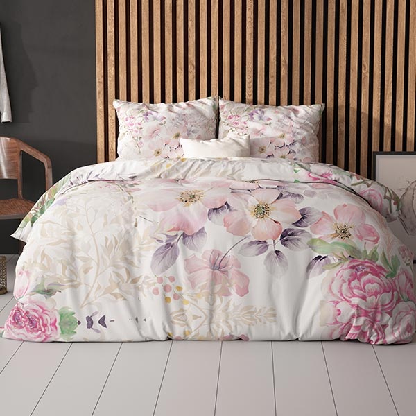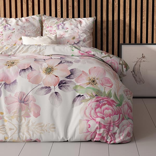 Dit Gyna dekbedovertrek laat je slaapkamer stralen met zijn zachte bloemenpracht. De grote roze en lila bloemen lijken bijna geschilderd, waardoor je bed verandert in een romantisch kunstwerk. Perfect om je kamer een frisse en dromerige sfeer te geven.