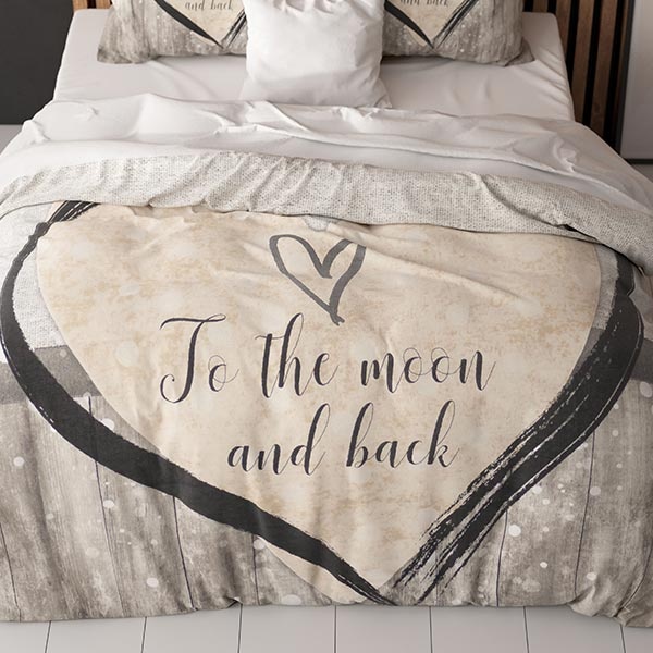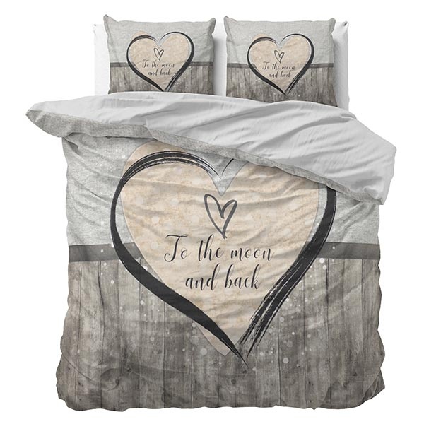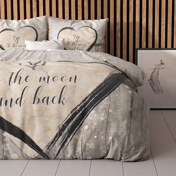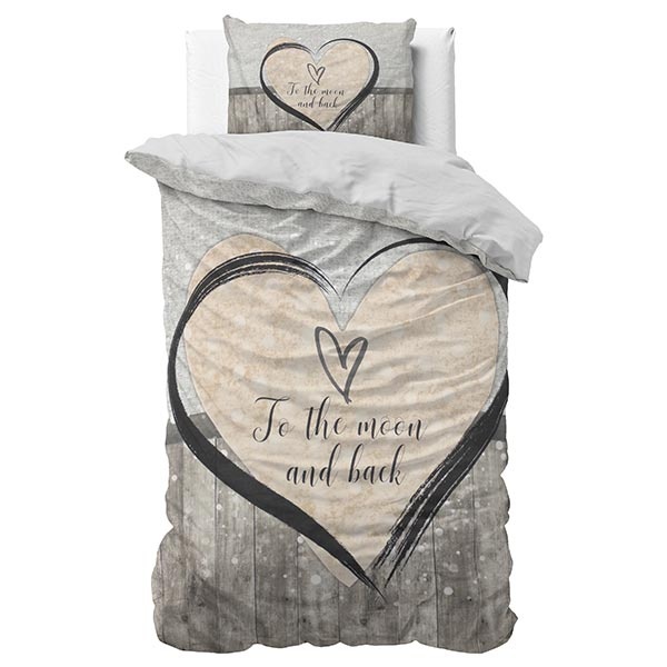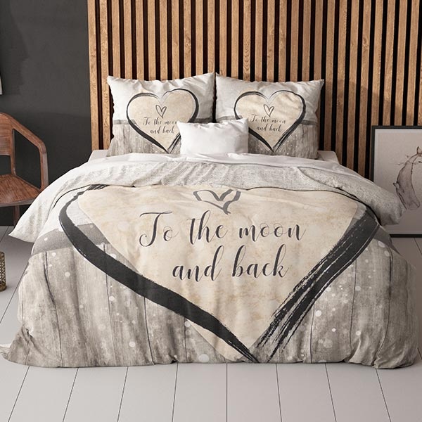 Het Love To The Moon And Back dekbedovertrek heeft een knus dessin met een betekenisvolle boodschap. De combinatie van natuurlijke houttinten, een groot hart en sierlijke letters maakt dit dessin perfect voor wie houdt van warmte en geborgenheid in de slaapkamer.