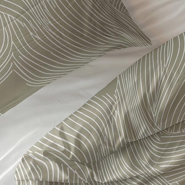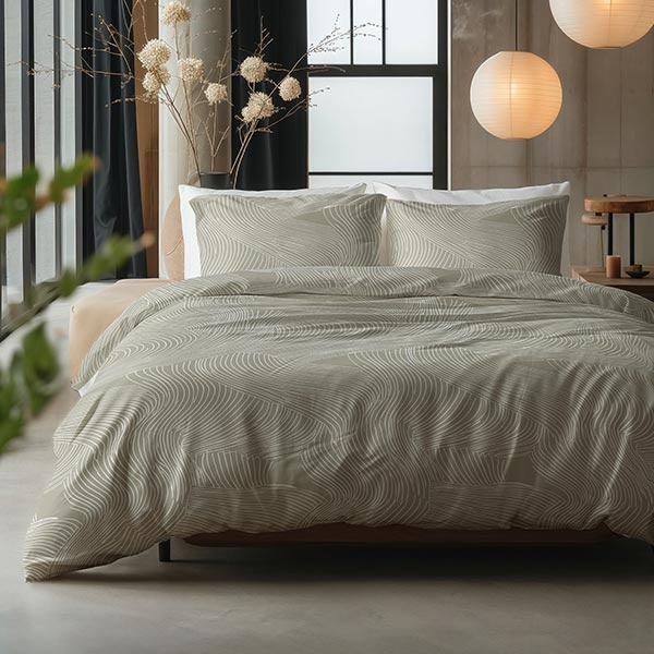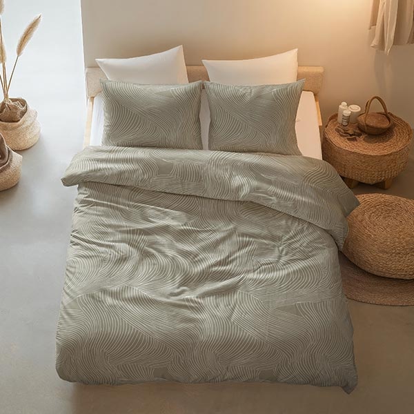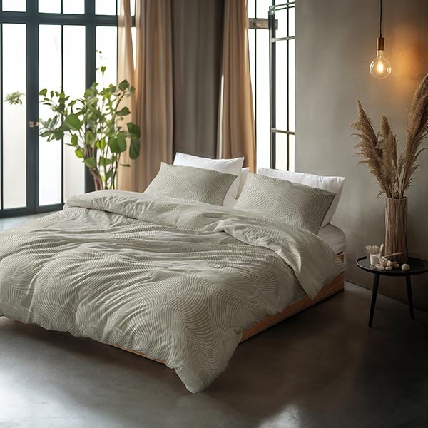 Het dessin van dit Ripple dekbedovertrek bestaat uit vloeiende, golvende lijnen die over het hele oppervlak bewegen en een subtiel dynamisch effect geven. De zachte taupe kleur in combinatie met het patroon zorgt voor een kalme, elegante sfeer in de slaapkamer.