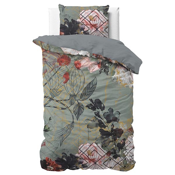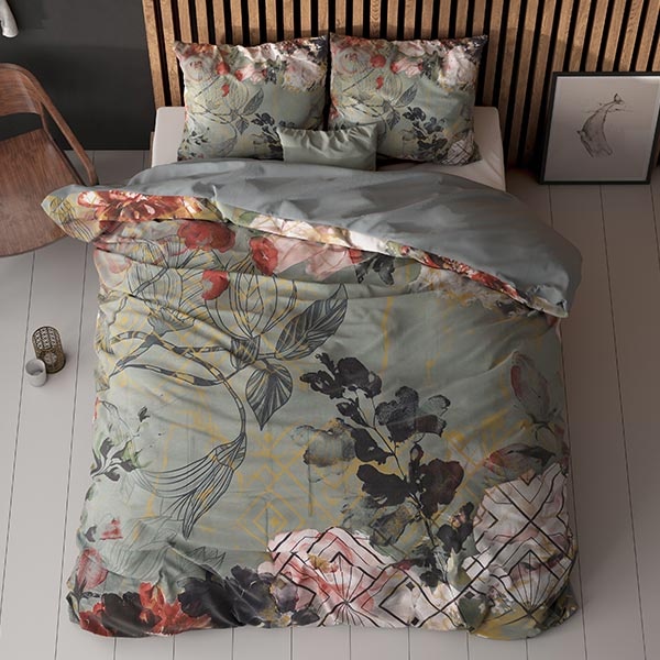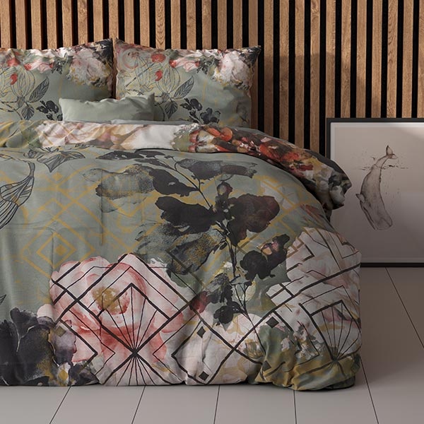 Het Triangle Nature dekbedovertrek bevat een verrassend samenspel van natuur en design. Bloemen, bladeren en grafische lijnen vloeien samen op een zachte groengrijze 'dusty green' ondergrond. Het contrast tussen organische vormen en geometrische patronen geeft dit dessin een moderne, kunstzinnige uitstraling.
